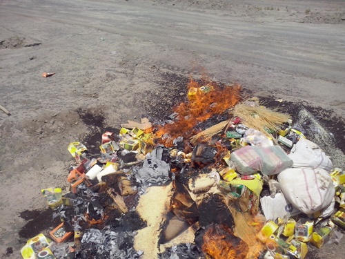 امروز و پس از آنکه اداره دام پزشکی نیز در جوابیه ای به شبکه بهداشت و درمان مصرف دامی مواد را ممنوع اعلام کرده بود ، با حضور علیپور نماینده مقام قضایی شهرستان داورزن و مهندس شهر آبادی و بهورز مزینان ، اجناس سوزانده شده و در محل مناسب دفن گردید .